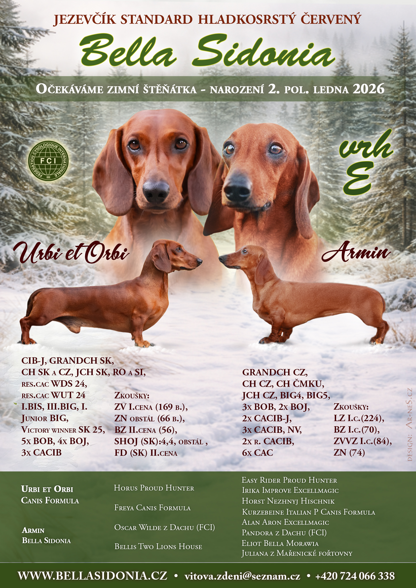 Oznamujeme, že se nám dne 20.11.2025 podařilo nakrýt naši mladou šampionku ARMIN a pokud se vše vydaří, tak můžeme již brzy (kolem 20.1.2026) očekávat radostnou událost narození štěňátek. Budoucím taťkou je importovaný červený vícenásobný šampion Urbi et ORBI Canis Formula z Itálie. Oba mají kvalitní exteriér a vlohy k lovecké upotřebitelnosti.